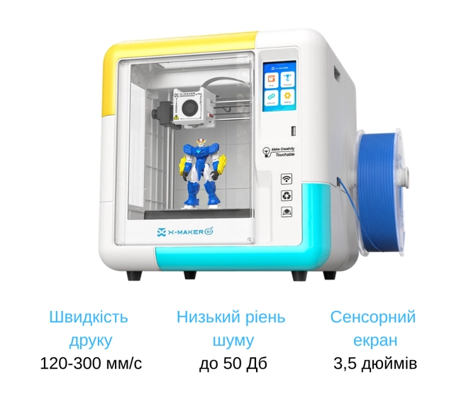Модель X-MAKER належить до інноваційних 3д принтерів, що поєднують простоту використання та професійну якість друку. Висока точність — до 0,03 мм, швидкість 120-300 мм/с та робоча область 150х150х150 мм забезпечують стабільні результати навіть при тривалому використанні. Завдяки підтримці PLA та ABS матеріалів можна експериментувати з різними типами філаментів, створюючи функціональні моделі або креативні вироби.