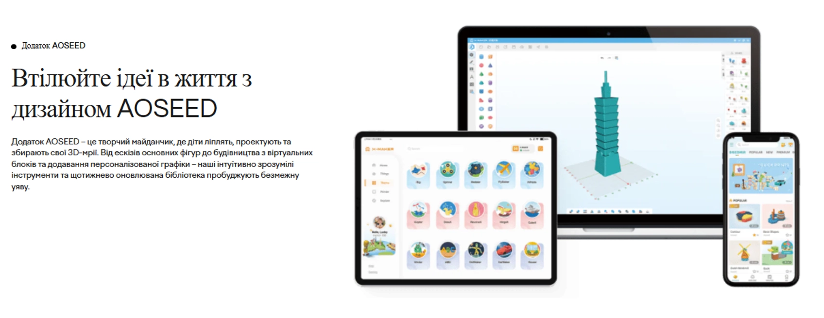 Тематичні додатки для дизайну включать гейміфікацію, забезпечуючи захопливий результат. Надруковані на 3D-принтері власні іграшки розширюють варіанти ігор.