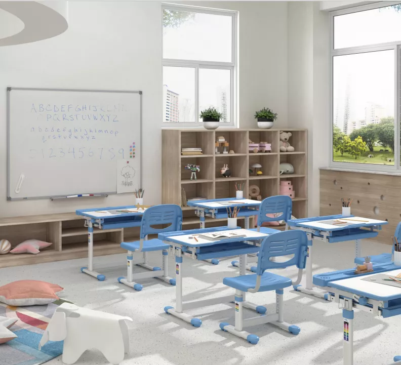 - Стіл і стілець оснащені ергономічним дизайном для підтримки правильного положення тіла під час навчання.