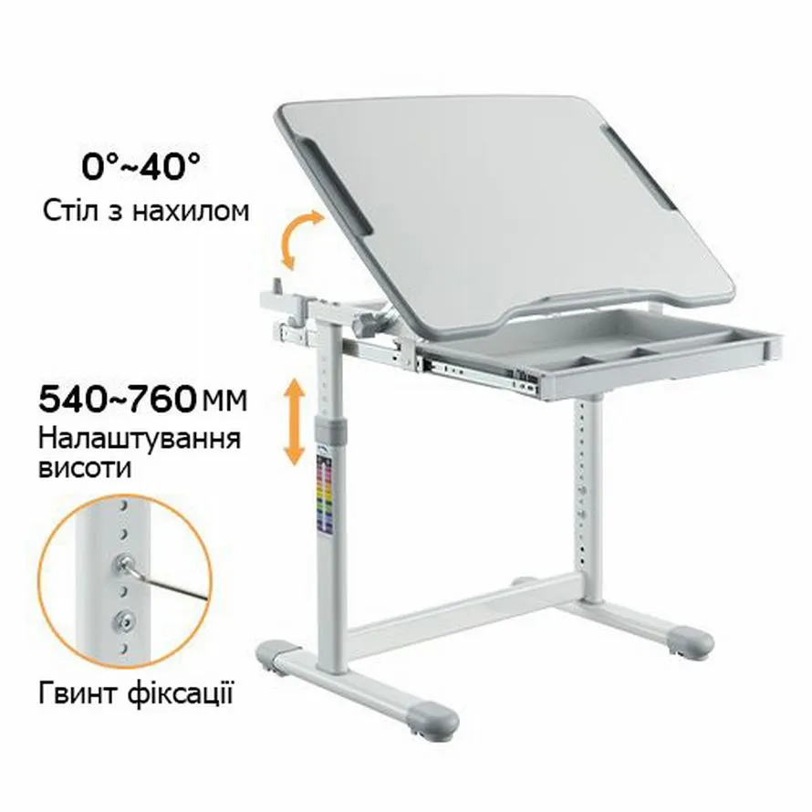 Регулювання висоти столу: 540–760 мм, гвинтова фіксація