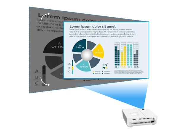 Функція двовимірної корекції горизонтальних і вертикальних трапецієподібних спотворень прибирає трапецоїдні викривлення, якщо проектор розміщено не під прямим кутом або встановлено не в центрі. Проектор можна без проблем розміщувати в будь-якому місці круглого столу, завдяки чому ви завжди матимете широкі можливості проведення презентації та якісне зображення.