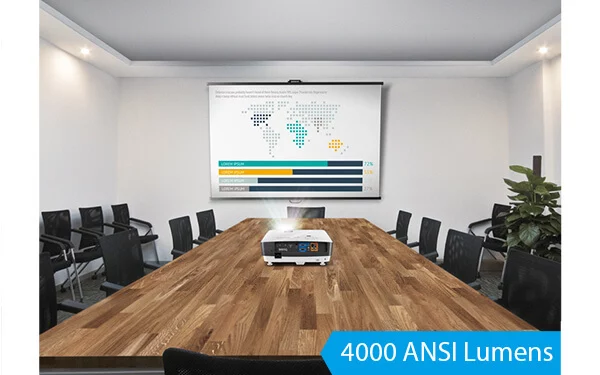 4000 люменів високої яскравості забезпечують можливість зручного проведення презентацій з увімкненим світлом, що сприяє обговоренням, співпраці та конспектуванню у великих добре освітлених приміщеннях до 40 учасників. Висока яскравість дає змогу учасникам, що перебувають найдалі від проектора, чітко бачити кожен слайд. Крім того, це покращує якість зображення завдяки яскравому кольору зображень і відео, а також чіткого тексту та деталей.