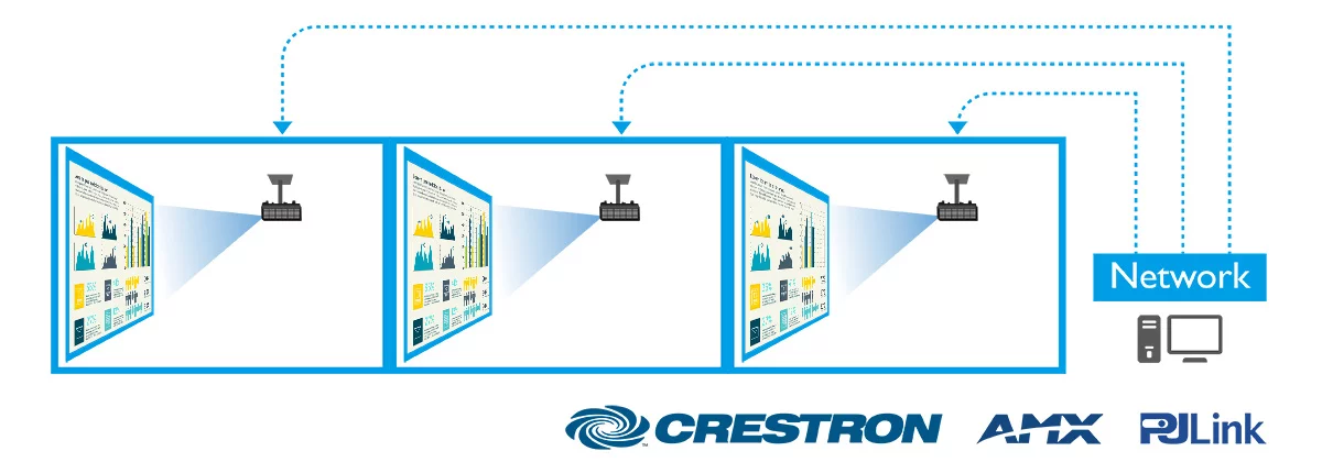 Проектори BenQ для бізнесу сумісні із широким рядом провідних систем керування, включно з Crestron, AMX, PJ-Link і Extron Control IP Link*, які дають змогу керувати проекторами через LAN, що забезпечує просту інтеграцію в локальні мережі. Крім того, ці проектори підтримують кабельний інтерфейс RS-232, який забезпечує надійність віддаленого монтажу на відстані до 15 метрів на випадок відсутності локальної мережі.