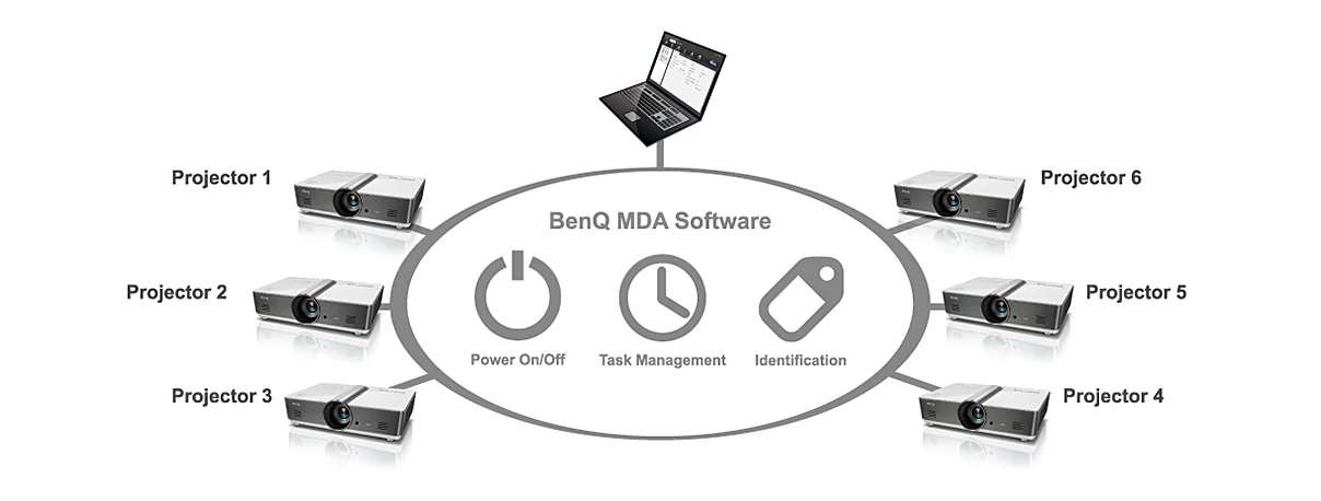 Диспетчер декількох дисплеїв (MDA) забезпечує потужне централізоване керування багатьма проекторами, а також пропонує автоматичну процедуру відкриття та закриття в місцях загального користування, дистанційне ввімкнення й вимкнення живлення та роботу за графіком в установах і корпораціях.