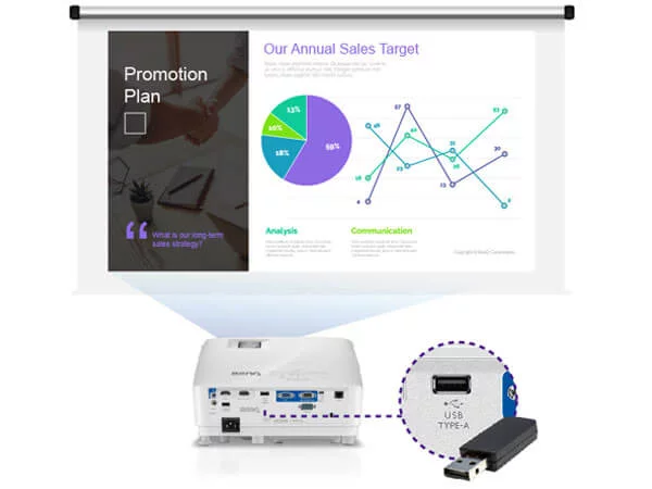 Завдяки підтримці широкого кола файлів, включно з файлами JPEG, PDF, Microsoft Word, Excel і PowerPoint, порт USB Type-A дає змогу легко відтворювати зображення або документи, не підключаючи проектор MH733 до ноутбука.